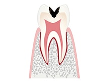 象牙質まで虫歯が進んでいるため、治療が必要です。ウ蝕検知液を使用し、感染が進んで再生不可能な部分だけ注意深く除去して修復します。