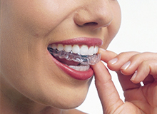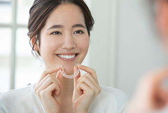 ご自身で自由に取り外しができます。食事の時には取り外すことができるので、治療中も普段通りに食事や歯磨きが可能です。
